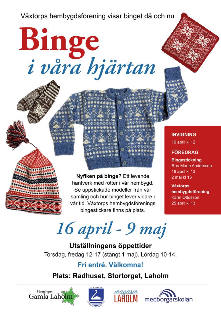 Nu laddar vi upp för nästa utställning på Rådhuset, ”Binge i våra hjärtan”. Välkomna från 16 april och framåt tors-, fre- och lördagar. Se uppstickade modeller och prata med bingestickarna på plats. Missa inte föredragen på lördagarna.