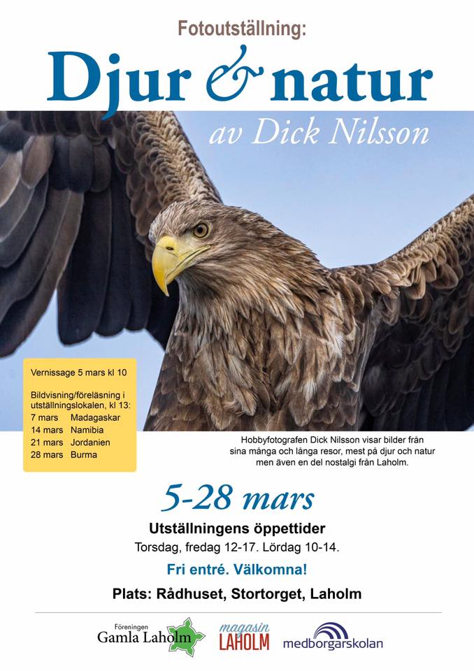Årets första utställning är en fotoutställning med en av Laholms duktiga fotografer, Dick Nilsson, som dokumenterat djur och händelser runt om i världen, det visas även bilder från Laholm. Öppet i Rådhuset 5–28 mars, torsdag & fredag kl. 12–17, lördag 10–14.